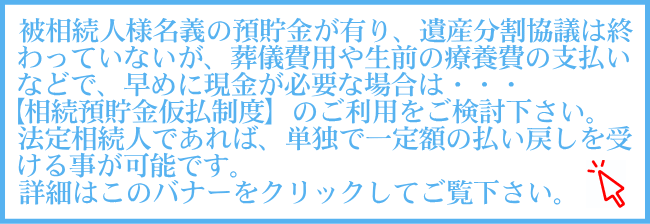 被相続人(お亡くなりになられた方)が名義人となっている預貯金口座は、新聞のお悔やみ欄への掲載や行員さんなどの情報で金融機関側で死亡が確認されると凍結され、払い戻しも預け入れも出来なくなります。(口座振替の電気代等の振替も止まります。)平成28年の最高裁判決の影響で、ほとんどの金融機関において法定相続人や受遺者となる全員が共同して申出ないかぎり、一切の払戻しを受けられなくなりました。現実問題として、このような状態では葬儀費用の支払や故人の生前の医療費支払いも、相続人の大きな負担になります。其のために平成30年の相続法改正で、現在は裁判所が関与した手続きと金融機関での手続きが可能な方法が制度として設けられています。裁判所による手続きでは、家庭裁判所で調停や審判を行っていることが前提となるなど、早急な資金が必要な場合には適していません。しかし金融機関での手続きの場合、次の計算式の範囲内で被相続人様の預貯金から仮払いを受けれる可能性があります。